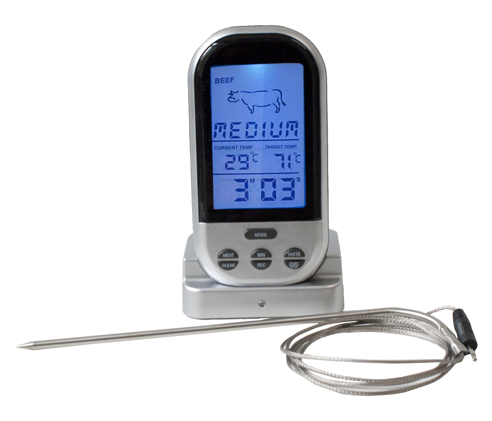LCD screen with red LED backlight, °C/°F switchable 8 meat types + 5 doneness levels