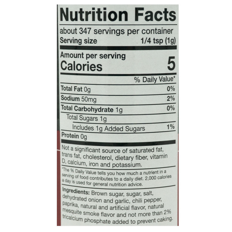 Ingredients: Brown sugar, sugar, salt,dehydrated onion and garlic, chili pepper, paprika, natural and artificial flavor, natural mesquite smoke flavor and not more than 2% tricalcium phosphate added to prevent caking.